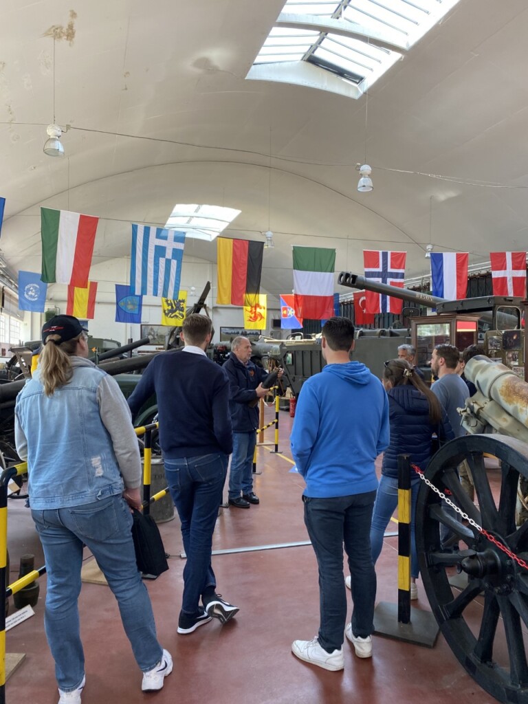 Allereerst een goede lunch gebruikt op het terras en we werden hoogst vriendelijk ontvangen door de aanwezigen. Daarnaast trok onze vloot behoorlijk wat bekijks, zoveel blauw op het veld was natuurlijk bijzonder. Menig wandelaar en/of fietser stopte even op het naastgelegen fietspad (airside dus) om de vloot te aanschouwen en eventueel vast te leggen op de gevoelige plaat van zijn/haar mobiele telefoon. Na een zeer goede maaltijd werd ons een rondleiding aangeboden in het naastgelegen militair museum, entree betaald door de club, waarvoor natuurlijk onze hartelijke dank. Vol passie legden 2 heren ons veel uit over de aanwezige voertuigen opgesteld in een oude hangaar, veelal tanks, grote tank, kleine tank, electrische tank en voor de variatie nog eens een tank. Het tweede deel werd ons een andere ruimte getoond met allerlei ander militair spul zoals uniformen, badges, plakkaten, attributen en media-artikelen. Zowaar werden we uitgenodigd om zelf eens in een tank te gaan zitten. OK de corona kilo’s zaten bij sommigen in dit geval wel wat in de weg en als je 2 meter lang bent is dat prima om een Cessna in te klauteren, maar een tank betreden kan dan verrekte lastig zijn. Al met al een zeer aangename rondleiding. Wat ook super aangenaam was was het weer! Dus werd unaniem besloten om voor vertrek echt nog eerst een drankje te doen eer we op weg gingen naar Lelystad. Rond 17:00 was het welletjes en vertrokken we naar huis. De vlucht terug was wederom een cadeautje met mooi zicht en ieder koos zijn eigen route. De mijne wat extra mijl en ging over mijn huis in Leiden en een stuk door de Amsterdam CTR.